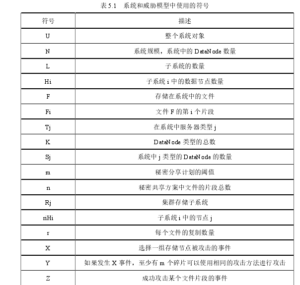如果文件??不能被攻击者重建,则文件??的机密性得到保证。给定一个数据分配决定??,本文可以通过从1中减去??(??)得到存储在 Hadoop系统中的文件??的存储保证??(??)如下: